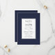 Simple et élégant, ce mariage de bon goût enregistrer la carte date utilise un cadre bleu marine simple entourant votre texte. Une double bordure gris mince entoure le texte pour ajouter des détails supplémentaires à la conception. De magnifiques appareillages type-face de script et de texte serif transmettent vos détails avec élégance. Le dos de la carte a un modèle photo pour ajouter votre photo fiançailles ou autre photo désirée pour customiser la carte. Personnalisez le modèle de texte avec les détails de votre mariage.