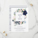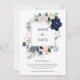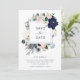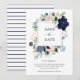 Cette carte de save the date de mariage élégante présente un cadre de fleurs aquarelles bleu marine, bleu clair et rose blush avec des feuilles vertes et beige neutre. Le dos de la carte présente des rayures bleues marines et blanches.