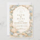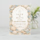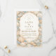 A refined coastal wedding design featuring an elegant oval wreath of seashells, oyster shells, starfish, and soft sea glass accents. Neutral sandy tones blend with muted ocean blues and delicate dune grasses to create a serene seaside aesthetic. The warm parchment background enhances the natural textures while maintaining a timeless, elevated feel. Perfect for a romantic beach celebration with classic coastal charm.