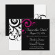 Enregistrez la carte Date pour correspondre à notre noir et blanc avec fuchsia / magenta accent faire-part de mariage inverse tourbillon, avec l'arrière - plan graphique tourbillon feuille de défilement. Customisez en ligne avec vos coordonnées de mariage.