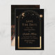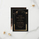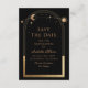 Celestial Black Save The Date Anniversaire Quinceanera Invitation présente un cadre doré, lune et étoiles sur un arrière - plan noir. À l'intérieur est votre Quinceanera personnalisée enregistrer les informations de date et au verso ajouter votre photo préférée. Personnalisez en modifiant le texte dans les zones de texte. Conçu pour vous par ©2024 Evco Studio www.zazzle.com/store/evcostudio