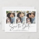 Modern manuscrit Enregistrer la date Carte photo multiple en noir et blanc dans une police qui est élégant et évoque une sensation romantique manuscrite. Conçu pour utiliser trois de vos photos préférées pour une personnalisation supplémentaire. Ajoutez facilement vos noms et dates pour un design vraiment personnalisé. Veuillez nous contacter à cedarandstring@gmail.com si vous avez besoin d'aide pour la conception ou les produits correspondants.