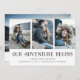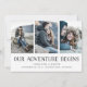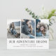 Un rustique enregistrer le carte photo de date pour le couple extérieur et aventureux, conçu pour accueillir trois de vos photos fiançailles préférées alignées côte à côte, avec une photo de fond supplémentaire au dos. "Our Adventure Begins" apparaît en noir le long du bas, avec vos noms, date du mariage et emplacement du mariage en dessous. Ajoutez votre site Web mariage à l'arrière ainsi qu'une indication qu'une invitation formelle suivra.