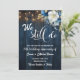 Un élégant anniversaire de mariage Save the Date Card avec élégante calligraphie complétée par de merveilleux bois bleu, des lampes à cordes de jardin et du bleu blanc floral avec parties scintillant d'or. Vous pouvez personnaliser cette carte avec vos détails d'anniversaire pré-Mariage.