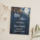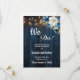 Une élégante Carte Save the Date avec élégante calligraphie complétée par un magnifique bois bleu, des lampes à cordes de jardin et un floral bleu blanc avec parties scintillant d'or. Vous pouvez personnaliser cette carte avec vos détails pré-Mariage.