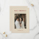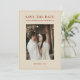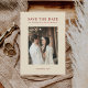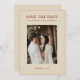 Cette annonce chic Save the Date présente un livre de cuisine moderne comme feel. La façade minimaliste est ornée d'une photo, d'un texte serif classique et d'un arrière - plan beige crème. L'arrière du faire-part dispose d'espace pour enregistrer le message de date.
