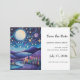 Enregistrez la carte de date avec une belle illustration. L'ambiance fantaisiste et fantaisiste. Une grande lune brillante avec des étoiles tout autour. Perché sur un beau paysage d'arbres, de montagnes et d'une rivière sinueuse.