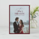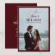This luxury burgundy and ivory photo Save the Date card features a refined minimalist layout framed with a rich maroon border. The front showcases elegant script and classic serif typography, while the back highlights a romantic engagement photo for a timeless and personal touch.