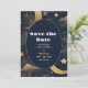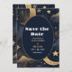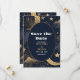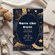Cette carte élégante et céleste "Save the Date" donne le ton pour votre journée de mariage enchanteresse. Le fond bleu nuit profond associé à des accents dorés scintillants crée une atmosphère de mystère et de sophistication, capturant l'essence de votre célébration sur le thème céleste.