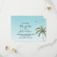 Ces annonces personnalisées Save the Date présentent un thème tropical pour une destination ou un simple mariage sur la plage. Une image de palmier est photographiée à droite, avec un troupeau d'oiseaux volant au-dessus. L'arrière - plan est un dégradé bleu ciel. Les noms du couple sont imprimés sur la gauche dans une police de script élégante, suivie de la date et de l'emplacement du mariage.