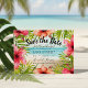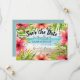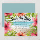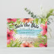 Les cartes de sauvegarde tropicales présentent une plage aquarelle, des fleurs d'hibiscus roses et corail et des feuilles de palmier qui entourent vos noms, date de mariage, lieu et site web de mariage ou d'autres informations. Le verso est d'un beau bleu océan. Personnalisez avec vos noms et informations de mariage.