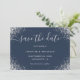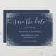 Elégant mariage bleu marine et argent enregistrer la carte de date avec une police script moderne sur un arrière - plan bleu marine orné de coins parties scintillant argent. Éléments correspondants disponibles.