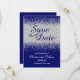 Cette carte moderne et classe "Save the Date" a un effet parties scintillant glissant sur un riche arrière - plan bleu royal. Vous pouvez customiser le style et la couleur de police comme vous le souhaitez et modifier la couleur arrière - plan de la carte. Cela fait partie d'une belle suite mariage assortie qui peut être entièrement personnalisée.