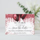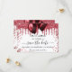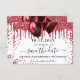 Un arrière - plan blanc chic décoré de faux parties scintillant rouges et de ballons. Personnalisez et ajoutez une date et un nom/âge. Le texte : Save the Date est écrit avec un grand script de style à la main tendance.