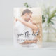 Transparent recouvrant une photo personnalisée et personnalisable sur le recto et le verso des élégantes et modernes Cartes de Sauvegarde de Date de Mariage - comprend une typographie de script élégante et belle pour la célébration spéciale du jour du mariage.
