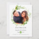 Cartes de mariage vertes et blanches avec fougères, fleurs sauvages et fraises et un fond lavis aquarelle vert sauge.
