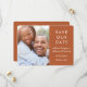 Un design moderne simple pour annoncer votre date de mariage avec votre photo préférée et une typographie blanche classique pour tous vos détails importants. L'avant et l'arrière sont en terracotta