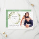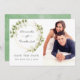 Cartes de photo de mariage à sauvegarder la date avec feuilles aquarelles vert sauge et blanc et cadre géométrique doré.