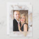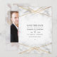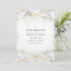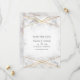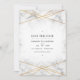 Faire-part de mariage avec une texture de marbre avec un cadre géométrique doré et un revers en marbre à feuilles dorées.