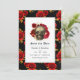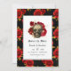 Économisez la date de mariage gothique rouge cramoisi, noir et or avec un crâne orné de roses rouges et un motif de rose dramatique.