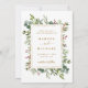 Cette invitation de save the date de mariage comprend des branches de eucalyptus aquarelles peintes, des feuilles vertes, des baies rouges, des branches de pin et un cadre rectangle en or faux avec du texte personnalisé au verso. Pour une personnalisation avancée de ce design, veuillez cliquer sur le lien "Personnaliser davantage". Des articles assortis sont également disponibles.