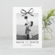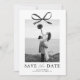 Annoncez votre prochaine célébration avec style et élégance grâce à ces cartes de save the date de mariage modernes. Conçues avec un fond blanc impeccable, l'avant présente un superbe centre de photo accentué par un nœud en aquarelle noir classique, ajoutant une touche de romance et de sophistication.
