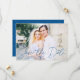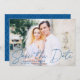 Annoncez votre date mariage dans le style avec notre photo moderne tendance enregistrer les cartes de date. La conception affiche votre photo de fiançailles horizontal à fond saigné avec "Enregistrer la date" dans une superposition de script manuscrit bleu avec un dégradé blanc en option. Personnalisez l'avant de sauvegarder le carte photo de date en ajoutant vos noms, votre date de mariage et votre emplacement de mariage. Le simple enregistrement du carte photo de date revient à un motif géométrique pointillé bleu et blanc.