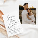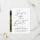 Annoncez votre prochain mariage dans le style avec cette photo moderne de script noir enregistrer la carte de date! Le design inclut "Save the Date" affiché en calligraphie noire tendance. Personnalisez le minimaliste enregistrer la date avec vos noms, date mariage, emplacement et site Web mariage. L'invitation s'inverse pour afficher votre photo de fiançailles vertical à fond de sang. Le noir et blanc chic sauve la date le choix parfait pour les mariages modernes.