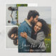 Carte d'annonce de mariage moderne avec un design simple avec une typographie élégante sur votre photo préférée à l'verticale. Le verso comporte deux photos carrées ainsi que votre message personnel en noir et blanc.