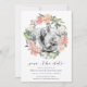 Notre Floral de Midété enregistrer la carte de date cadre votre photo fiançailles préférée avec une couronne ronde de rose d'aquarelle peinte et des fleurs de pivoine dans des tons doux de rose rousse, pêche et crème, accentué de verdure, eucalyptus et de lettrage chic. Un choix moderne et élégant pour les mariages de printemps ou d'été. Personnalisez avec vos noms, date mariage, emplacement et site Web mariage en utilisant les champs fournis.