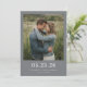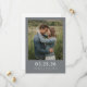Cette carte de faire-part de mariage présente une photographie émouvante d'un couple s'étreignant dans un champ, entouré de hautes herbes. Le design est encadré par une bordure grise unie et comprend un texte personnalisable pour la date et les noms, dans des polices sérif élégantes qui ajoutent une touche de sophistication. La palette de couleurs se compose de verts et de bruns naturels de l'arrière-plan, contrastés avec un bleu denim, créant un thème rustique et intime. L'ambiance générale est chaleureuse et personnelle, parfaite pour célébrer l'amour et la convivialité le jour de votre mariage.