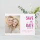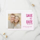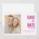 Cette carte de sauvegarde de date de mariage présente une mise en page divisée avec une photo à mise au point douce de deux personnes à gauche, sur un fond extérieur chaud. Le côté droit présente un texte magenta gras dans une police sans empattement moderne, associé à une écriture élégante pour les noms, créant une ambiance joyeuse et invitante. Le design équilibre la simplicité et la sophistication, utilisant efficacement l'espace négatif pour mettre en évidence les détails clés. Parfaite pour les couples qui souhaitent partager leur moment spécial avec leurs amis et leur famille, cette carte combine un style contemporain avec des touches personnelles.