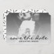 Moderne enregistrer la carte de date dans un design minimaliste. Ajoutez simplement une photo de vous et de votre partenaire. Save the Date est écrit dans un joli script sous forme de superposition photo. Le dos est orné d'un motif chic en noir et blanc avec des arrosages.