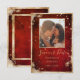 Envoyez cette belle carte de mariage « Save the Date » à tous vos proches pour les inviter avec élégance à votre événement spécial. Le fond rustique rouge écarlate est d'un riche effet. Taillé dans un faux éclat doré pour donner le ton d'une élégance romantique et classique. Des éclaboussures dorées terminent cette jolie note « Save the Date » de mariage. Beau pour toutes les saisons.