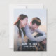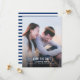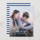 Style minimaliste enregistrer la photo de date avec des polices modernes. Il y a un dégradé en bas de la photo, ce qui est facultatif. L'arrière est à rayures bleues et blanches. Les polices et les couleurs sont personnalisables.
