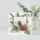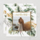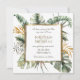 Photographie Save the Date dépeint un élégant motif de palmiers tropicaux aquarelle comprenant un cadre doré, de grands feuilles de monstère et des branches gracieuses d'eucalyptus dans les tons vert et or. L'introduction inspirante du dos est tirée de la Bible Verse Chanson de Salomon 3:4, "J'ai trouvé celui que mon âme aime." _