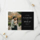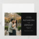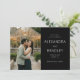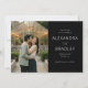 Cette invitation de mariage à date de sauvegarde présente une mise en page divisée avec une photographie romantique d'un couple s'étreignant devant une serre chaleureusement éclairée, créant une atmosphère intime et cosy. Le côté droit met en valeur un texte élégant sur fond noir, utilisant des polices sérif sophistiquées qui mettent en évidence les détails de l'événement. La palette de couleurs combine des verts naturels et des bruns du feuillage avec des teintes jaunes chaudes des guirlandes lumineuses, évoquant une sensation classique et intemporelle. Parfait pour donner le ton d'une célébration mémorable, ce design équilibre le charme visuel avec une communication claire, ce qui le rend idéal pour les couples qui souhaitent partager leur nouvelle spéciale avec style.