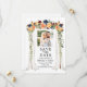 Carte d'annonce de fiançailles de mariage élégante moderne avec aquarelle florale et verdure pour mariage, y compris des fleurs et des roses jaunes dorés, pêche, bleues et rouges de Bourgogne. L'arche de canopée de mariage en bois comprend de la verdure botanique. Photo de couple.