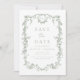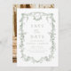 Annoncez votre journée spéciale avec un floral d'inspiration victorienne, sauvez la date dans élégant vert sauge. Ce design d'inspiration française présente des motifs floraux complexes qui évoquent une romance et un raffinement intemporels. La douce couleur bleue poussiéreuse apporte une touche sereine et raffinée, parfaite pour donner le ton d'un mariage classique et élégant. Idéal pour les couples à la recherche d'un style gracieux mais unique, cette date sauve mélange charme vintage et beauté moderne, assurant à vos invités une célébration vraiment spéciale.