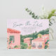 This destination wedding Save the date features painted artwork of a Mexican town scene with papel picado banners on top. All the important wedding details can be personalized. Colors include green, pink, white and coral.