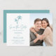 Cet élégant mariage de plage tropicale bleu aqua, à l'exception de la carte datant, présente deux palmiers au-dessus du texte, un script d'écriture élégante pour le faire-part "Save the Date", et une photo du couple heureux.
