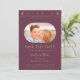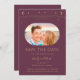 Mystical Plum Gold Sun Moon Stars Space Save The Dates dispose d'un cadre de soleil doré, de lune et d'étoiles sur un arrière - plan de prune. A l'intérieur est votre photo préférée et votre personnalisation enregistrer les informations de date. Personnalisez en modifiant le texte dans les zones de texte. Conçu pour vous par ©Evco Studio www.zazzle.com/store/evcostudio