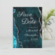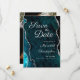 Élégant enregistrer la carte de date avec turquoise marbre bleu agate avec parties scintillant argent photo mariage enregistrer la carte de date. Photo en couple sur le dos. Annoncez votre journée spéciale avec notre Turquoise Silver Agate Enregistrer la carte Date. L'avant est décoré dans un style bleu aqua et argenté inspiré de pierres précieuses. Le dos de la carte comporte une photo du couple. Les couleurs riches et les détails de pierres précieuses donnent un ton inoubliable, tandis que la photo personnelle au dos permet à ceux qui sont chers de partager votre excitation dès le premier regard.