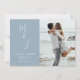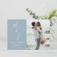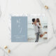 Annoncez votre jour de mariage avec votre photo impressionnante contre un arrière - plan bleu poudreux avec vos initiales dans un script de calligraphie moderne fantaisiste sur le devant de la carte, et feuilles botaniques doux au dos de la carte. Idéal Enregistrer la date pour les mariages, fiançailles, anniversaires et autres événements spéciaux.