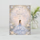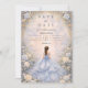 This elegant quinceañera design features a soft powder blue watercolor background framed by delicate ivory roses, subtle greenery, and ornate gold detailing, with a graceful gown illustration creating a refined, fairytale-inspired atmosphere. The cool blue palette paired with romantic florals gives the design a timeless, luxurious feel, perfect for a classic quinceañera celebration with an elegant garden aesthetic.