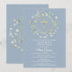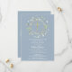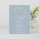 Une guirlande de verdure décorative et une croix dorée sont posées sur les informations de votre save the date de première sainte communion sur un fond bleu poussiéreux.