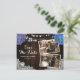 Romantic rustic purple and blue floral photo wedding save the date card featuring hydrangea flowers, string lights and elegant floral lace against a barn wood background. There are two burlap hearts and white floral lace on rustic wood background at the back.