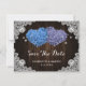 Romantic rustic purple and blue floral wedding save the date card featuring hydrangea flowers against a barn wood background adorned with white floral lace and twinkle lights.