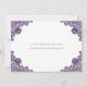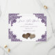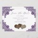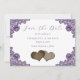 Elegant rustic purple wedding save the date card featuring purple floral lace and two burlap hearts.