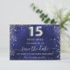 Une fête branchée Save the Date pour une Quinceañera, 15e anniversaire. Un arrière - plan bleu marine décoré de parties scintillant faux argenté, brille. La couleur bleue est inégale. Personnalisez et ajoutez une date et un nom/âge. Le texte : Save the Date est écrit avec un grand script de style à la main tendance. Numéro 15 avec une police de style ballon argenté.